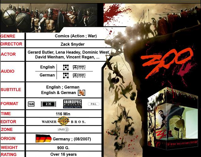 Besonderheiten: Zack Snyders Actionepos 300, Verfilmung des gleichnamigen Graphic Novel von Frank Miller, zählt mit seinem weltweiten Einspielergebnis von über 445 Millionen US- Dollar zu den erfolgreichsten Kinofilmen 2007. Um diesen Erfolg keinen Abbruch zu tun, veröffentlicht Warner Bros. gleich 5 verschiedene Versionen auf drei Formate (Blu- Ray, HD DVD & DVD).