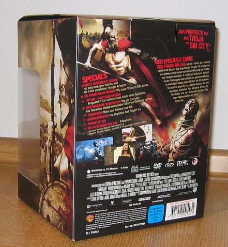 Das Highlight dieser Luxus- Edition ist sicherlich die Helmbüste, die jeden Filmfan in Rage bringt. Darüber hinaus bietet die CE jedoch mehr: ein 32- seitiges Buch 300: The Art of the Film, in dem Produktionsnotizen, Intentionen des Regisseurs und zahlreiche Bilder des Drehs verzeichnet sind, sowie 4 Sammelkarten mit Motiven aus dem Film. Und das alles in Top- Qualität.