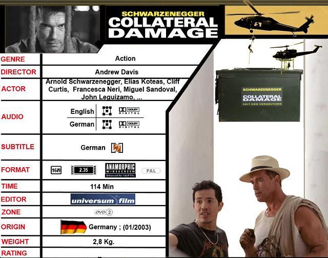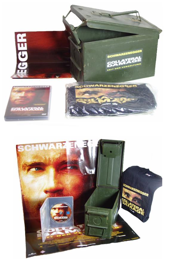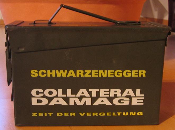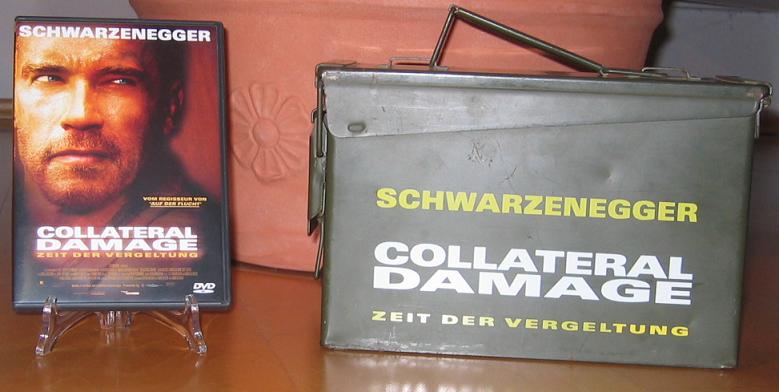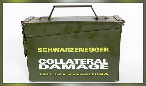 Es handelt sich um eine sehr robuste und schwere (1,70 KG) M60 Munitions-Box komplett aus Metall zum Film "Collateral Damage" aus dem Jahr 2002, in dem Arnold Schwarzenegger die Hauptrolle spielte. Der Deckel lässt sich öffnen und mittels eines sehr stabilen Mechanismus sicher verschließen. Es handelt sich hier übrigens nicht um die DVD-Verpackung, welche damals zum Erscheinen der DVD in einigen deutschen Media Märkten zu bekommen war und bei der die Schriftzüge nur aufgeklebt waren. Die Munitions-Box ist eine echte Munitionsbox aus US-Armee-Beständen, welche von der Filmproduktionsfirma damals aufgekauft und mit dem Filmtitel direkt bedruckt wurden. Von dieser Box ist nur eine kleine Stückzahl hergestellt worden!