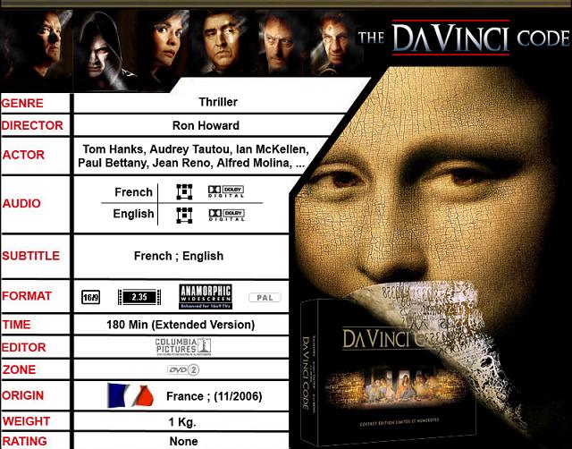 * Disc 2 (Bonus Disc): Der erste Tag am Set mit Ron Howard; Dan Brown erzählt; Ein Porträt über Robert Langdon; Wer ist Sophie Neveu? 'Unusual Suspects' - Internationale Besetzung; Magische Plätze Nahaufnahme - Mona Lisa; Die Reise der Filmemacher