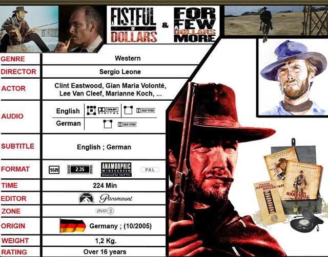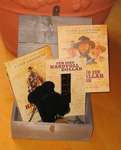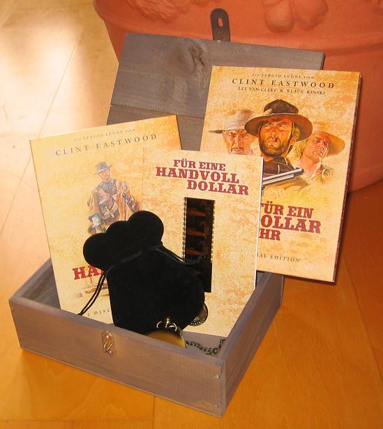 Am 06.10.2005 veröffentlichte Paramount die beiden Clint Eastwood Klassiker "Für eine Hand voll Dollar" und "Für ein paar Dollar mehr" auf DVD. Die limitierte Holzbox enthält neben den Einzeldiscs, die Filme in neuem "High Definition Transfer" auch noch eine Taschenuhr. Für Leone/Eastwood-Fans dürfte es schwer sein, um die Kiste einen Bogen zu machen.