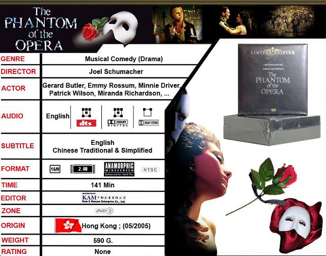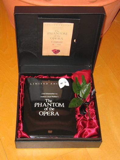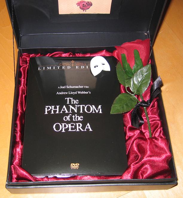Das "Gift Set" zu Joel Schumachers "Phantom of the Opera" enthält in einem schicken Koffer ein Digipack, welches neben dem Hauptfilm noch eine Bonus-DVD enthält. Zusätzlich liegt der DVD noch eine Plastikrose, sowie ein Pin der Maske des Phantoms bei! Das ganze wird durch ein informatives Booklet und ein Zertifikat abgerundet! Tolle Edition.
