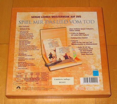 Die zwei DVDs befinden sich ein einem aufklappbaren Digipack. Die Soundtrack CD befindet sich on einem Pappcover. Die Mundharmonika befindet sich dagegen in einem sehr schönen Lederbeutel. Der Namensschriftzug wurde speziell für diese Box aufgebrannt.