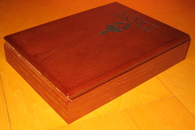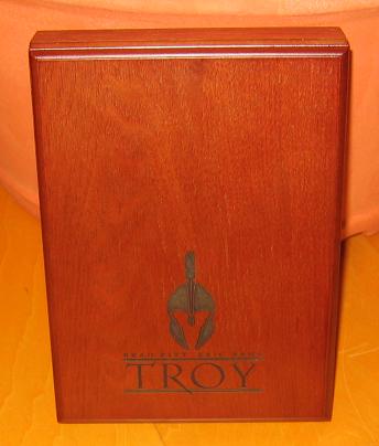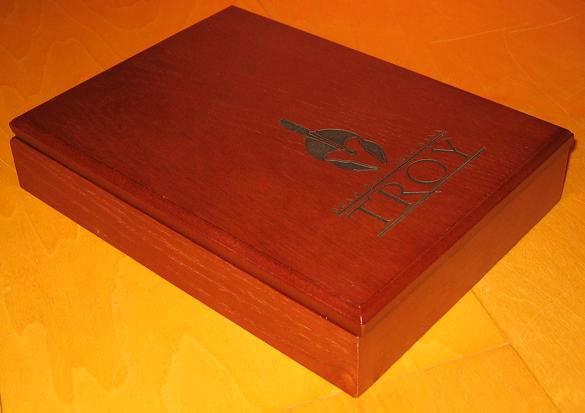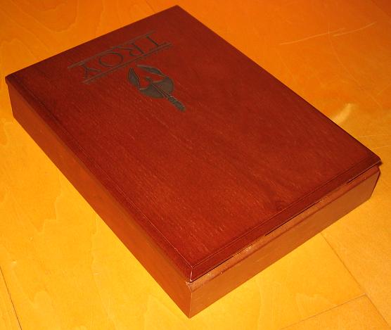 Schon auf den ersten Blick wird dem Zuschauer bewusst, welch´ schicke Sonderverpackung die Troy Limited Edition ist. Zu den Details: Die untere Hälfte des Frontcovers (des Deckels) ziert eine schwarze Prägung: der typische Helm des Achilles, darunter der Schriftzug Brad Pitt Eric Bana und am unteren Rand in großen Lettern steht der Filmtitel Troy. Die Prägung geht tief in die Box hinein. Man fühlt diese nicht nur, man sieht sie auch. Einmal mehr lautet die Devise: Weniger ist Mehr. Und das ist auch gut so, denn dadurch wirkt die Box edler und exklusiver. Die Holzbox passt sich der filmischen Thematik an und harmoniert farblich mit den Extras und der DVD. Im Vergleich zur Parfum Holzbox ist diese um einige Farbnuancen heller. Ein echter Hingucker.