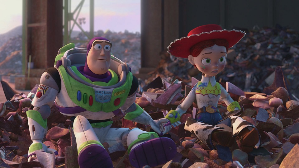 Doch einen Unfall mit einem Fernseher hat Buzz Ligthyear wieder seine Erinnerungen. In der Müllverbrennungsanlage werden alle Spielzeuge auf ein Förderband geworfen. Woody rettet Lotso, der eingeklemmt ist und vom Förderband klettern kann. Er wäre in der Lage das Förderband abzuschalten, aber beschließt lieber zufliehen. Die anderen werden von den Aliens mit einem Kran gerettet.