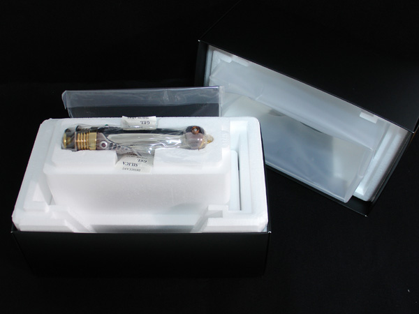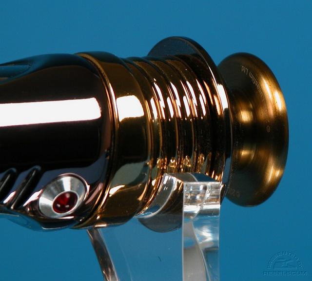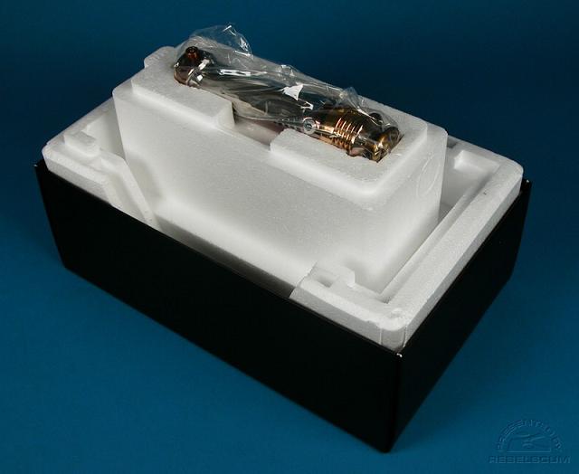 Das Display Case beinhaltet ebenfalls eine matt-schwarze Base mit verspiegelter Bodenplatte , Acrylfüße für das Lichtschwert und eine Acryl-Staubabdeckung.