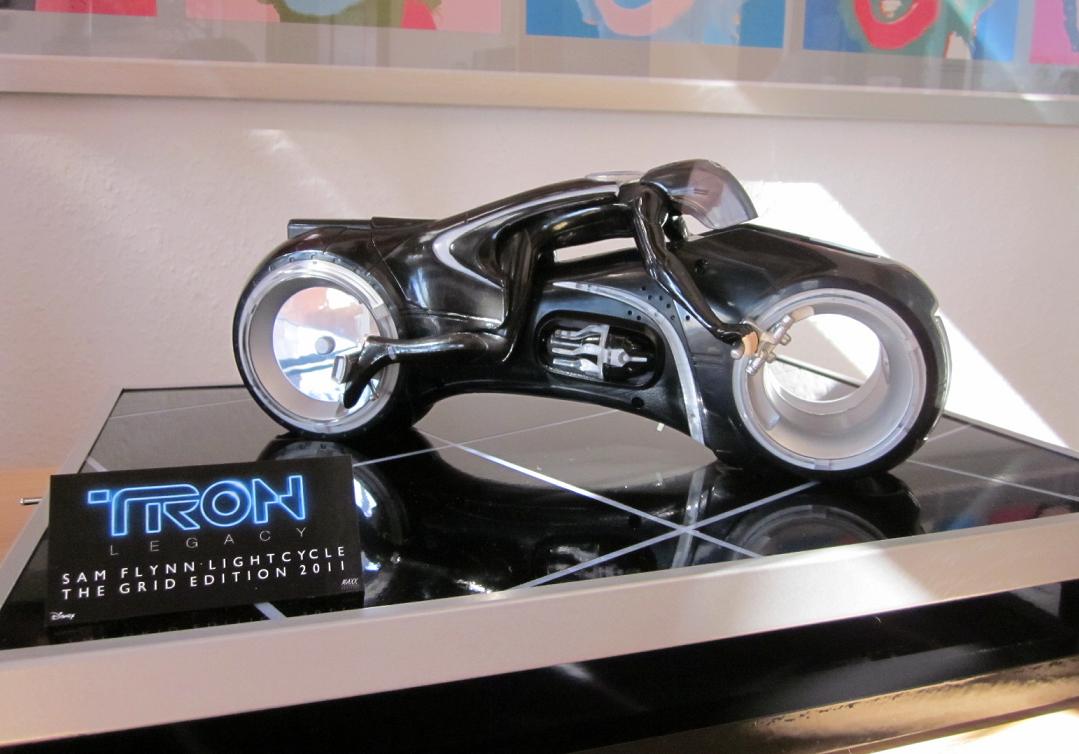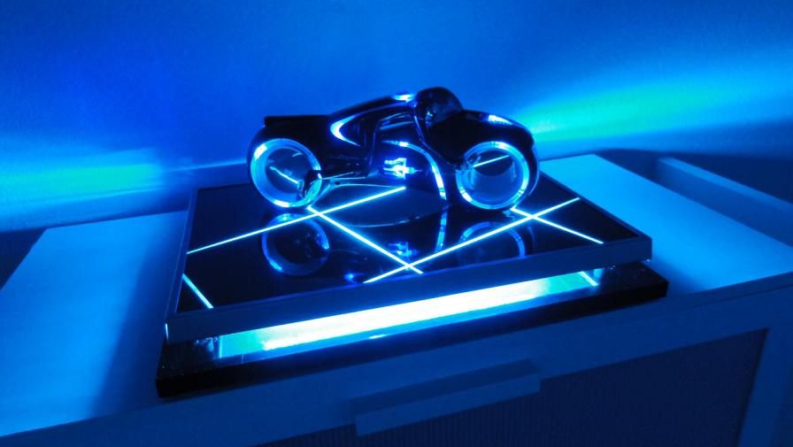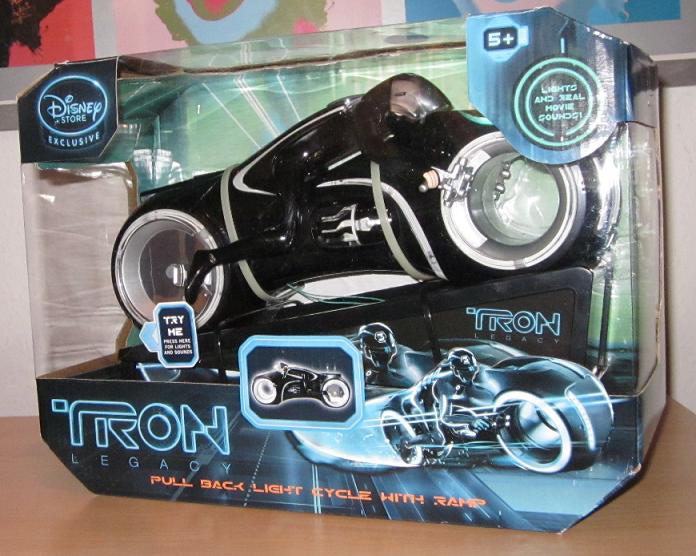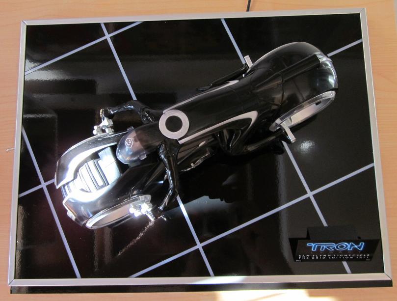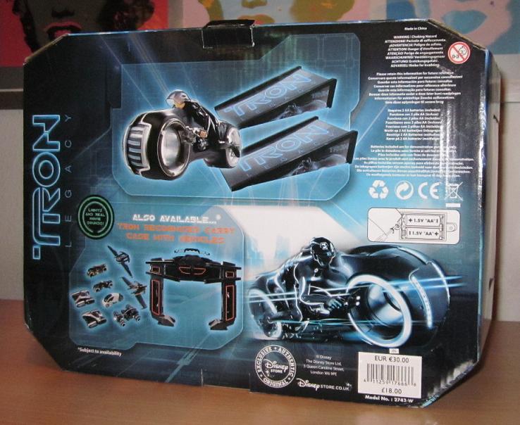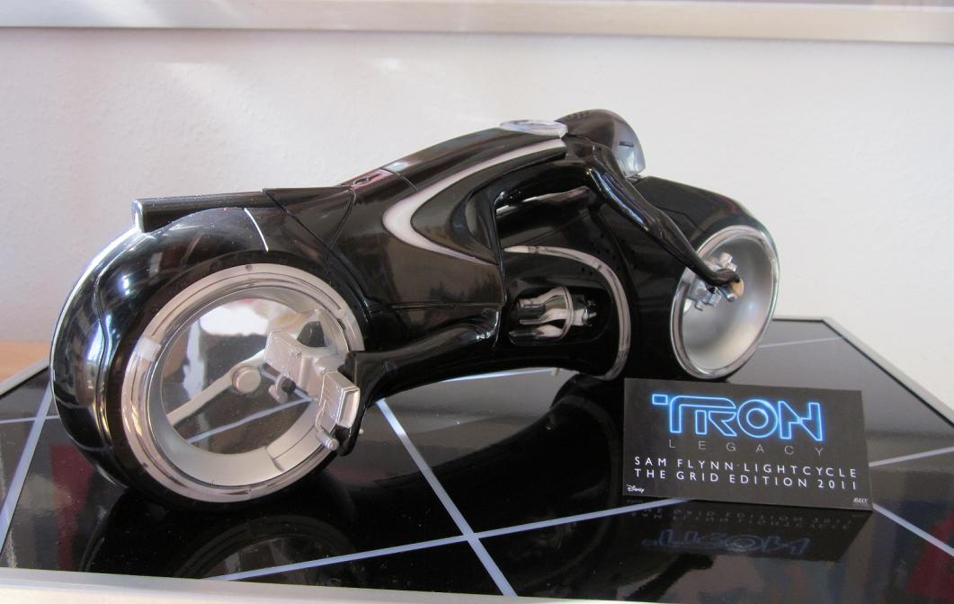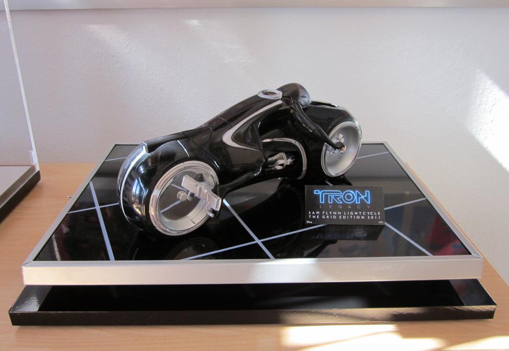 Zu sehen ist hier das Light Cycle aus dem Film TRON Legacy mit beleuchteten Modellständer im "Raster-Design". Es handelt sich bei dem Light Cycle um die exteme seltene "Pullback Version" die in Deutschland nicht im Handel war. Neben der Pullback-Funktion (Aufzugsmotor) bietet das Modell auch die passenden Sound- und Lichteffekte aus dem Film. Das Modell hat eine Länge von ca. 30cm und ist nach meinem Wissen damit das derzeit größte verfügbare Lightcycle Modell. (Stand Juli 2011)