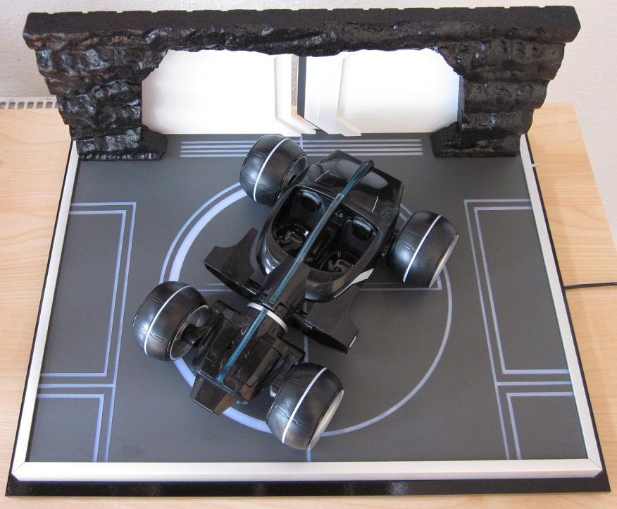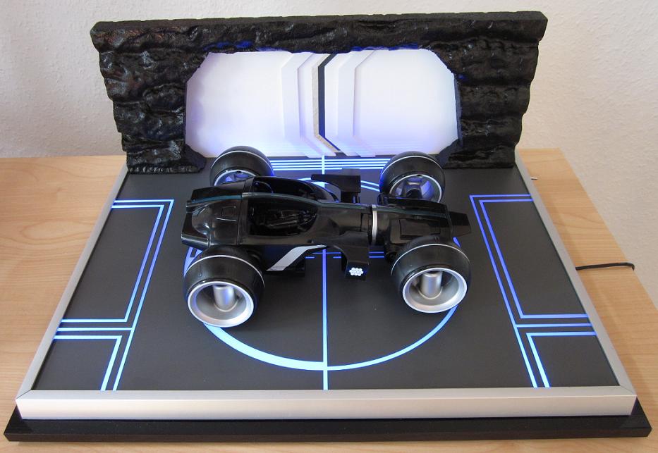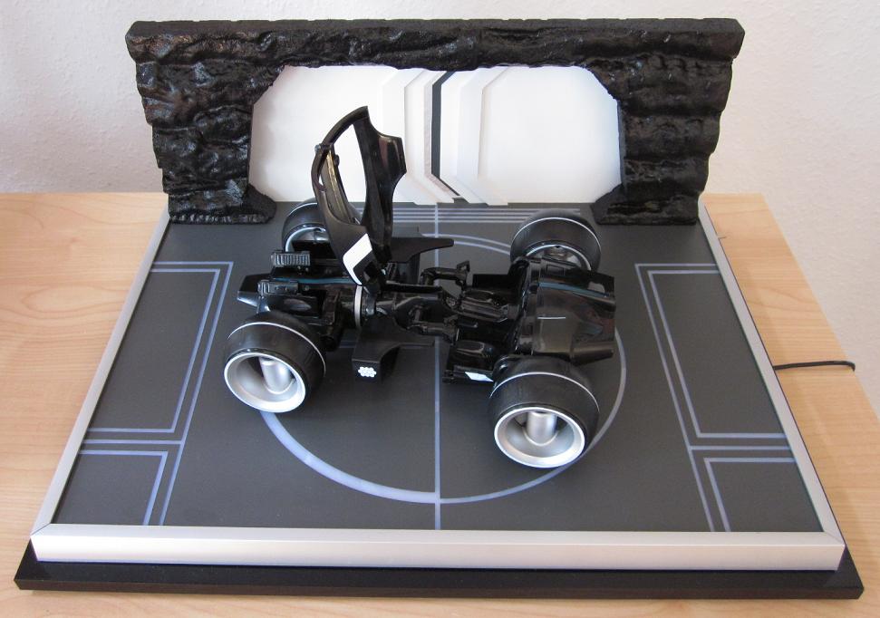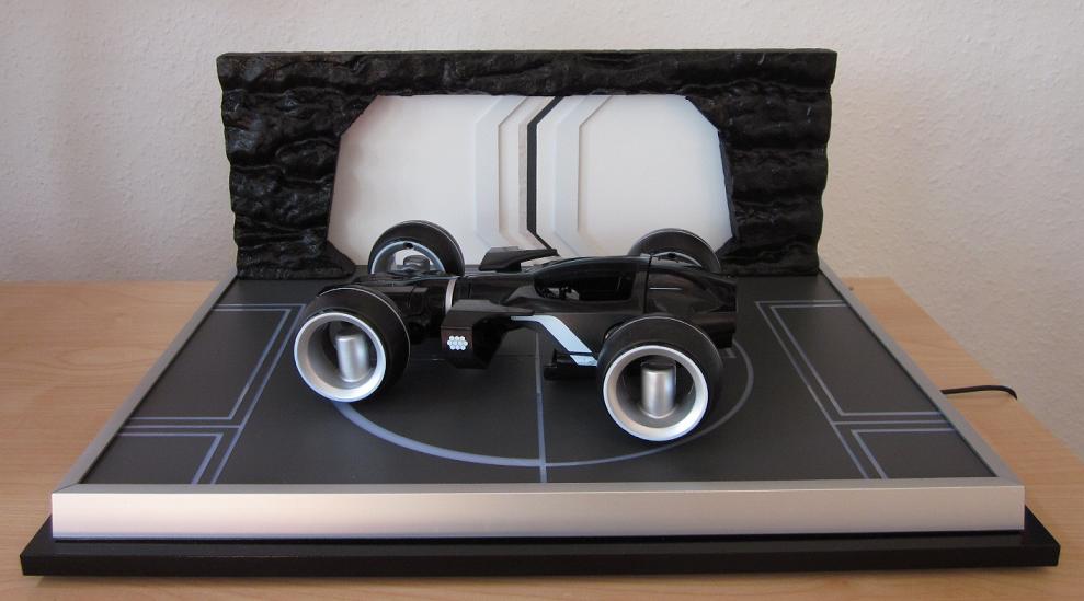 Zu sehen ist hier der Kevin Flynn Light Runner aus dem Film TRON Legacy mit beleuchteten Modellständer. Dieser hat die Abmessungen von ca. 43x33 cm. Die Stromversorgung des Modellständers erfolgt über ein 12V Netzteil. Atemberaubendes Design mit raffinierten Lichteffekten! Das Cockpit ist aufklappbar, die Länge beträgt 23cm. Die Kanonen lassen sich auch ausfahren! Das Light Cyle kommt aus dem Hause Disney.