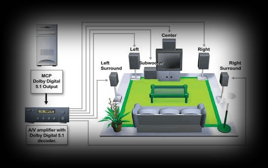 Die digitalen Signale des Dolby Digital-Tons müssen erst von einem Decoder in separateanaloge Kanäle umgewandelt werden. Diese Elektronik-Komponente gibt es entweder als separates Gerät oder als eingebauten Teil von Verstärkern,Receivern, DVD-Playern oder Fernsehern. Receiver und Verstärker mit integrierten Decodern schließt man einfach an den Digitalausgang des DVD-Players an (über eine optische oder eine elektrische Verbindung, siehe Audio-Anschlüsse). Die gesamte weitere Signalaufbereitung übernimmt der Receiver oder der Verstärker. Separate Dolby Digital-Decoder schaltet man zwischen DVD-Player und Verstärker. Dazu verkabelt man die sechs analogen Tonausgänge dieser Geräte mit den entsprechenden Eingängen eines Mehrkanal-Verstärkers oder Receivers. Sitzt der Decoder im Player oder im Fernseher, stellt man diese Verbindung ebenfalls her. Voraussetzung dafür ist natürlich, daß der Receiver oder der Verstärker überhaupt sechs separate Eingänge bietet. Nicht jedes Modell kann damit aufwarten; bei der Planung einer neuen Anlage sollte man deshalb auf dieses Detail unbedingt achten. Dolby Digital-Decoder können den Mehrkanalton auch auf zwei Stereokanäle heruntermischen und analog ausgeben. Diese Signale kann man dann über eine zweikanalige Stereoanlage oder mit einem Dolby Surround Pro Logic-Decoder als vierkanaligenDolby Surround -Ton wiedergeben. Dieses ist wohl eines der bekanntesten Tonstandards, welches seit dem 5 Dezember 1997 auch zu den Standard Tonformaten für PAL DVDs gehört. Ursprünglich war als Tonformat für PAL DVDs das MPEG Format vergesehen und Dolby Digital hätte immer nur als zusätzliche Tonspur vorhanden sein können. Da die MPEG Fraktion aber keinen funktionierenden Mehrkanalton Codec entwickeln konnte, keine MPEG Decoder in den Haushalten vorhanden waren und die Industrie endlich auch in Europa mit der DVD starten wollte, wurde Dolby Digital nachträglich in den Status eines Standardformates für PAL DVDs gehoben. Das Tonformat Dolby Digital ist sehr vielseitig und kann von 1 - 6 Kanälen Daten diskret speichern. Dabei haben alle normalen Kanäle einen Frequenzumfang von 20Hz - 20.000Hz und der LFE (Low Frequency Effekt) Subwoofer Kanal einen Frequenzumfang von 20Hz - 120Hz. Mit dem Dolby Digital Tonformat lassen sich auch Mono Tonsignale bei Verwendung des DD 1.0 (nur 1 Kanal wird benutzt) übertragen. Ebenso ist es natürlich möglich auch nur ein Stereo Tonsignal zu übertragen. Dazu wird das DD 2.0 Format benutzt, bei dem zwei Kanäle benutzt werden und als Indikator für Stereo das Dolby Surround Flag auf Off (DS=Off) gesetzt wird. Da mit einem einem DD 2.0 Signal auch Dolby Surround Informationen übertragen werden könnten, ist dieser Indikator als Unterscheidungs Merkmal sehr wichtig und den Ton auch korrekt Reproduzieren zu können.
