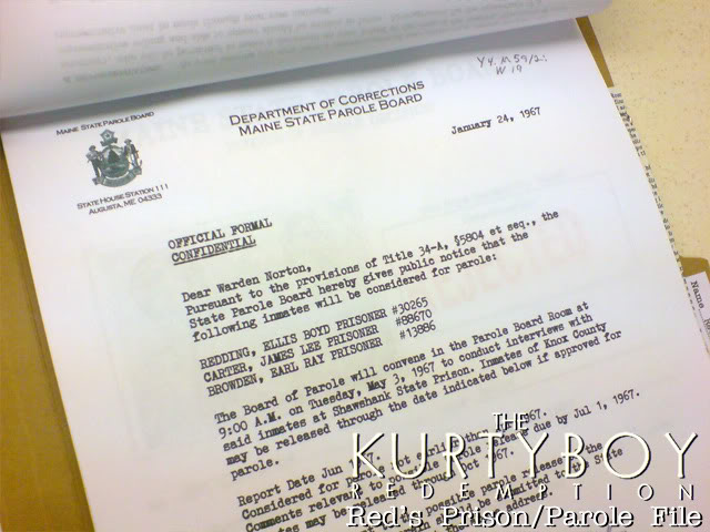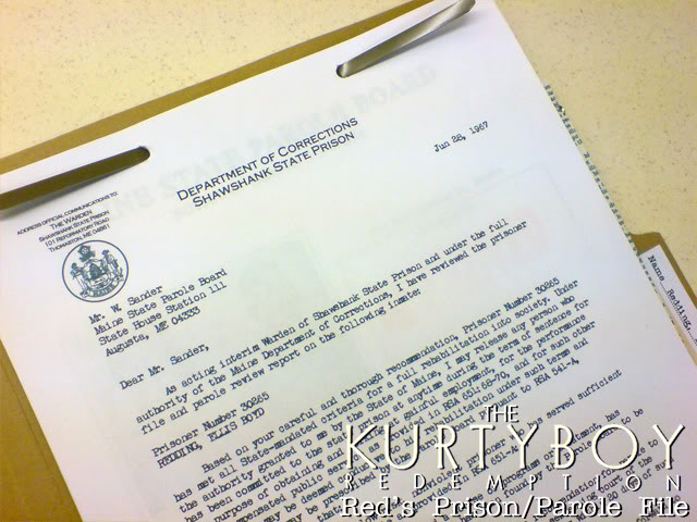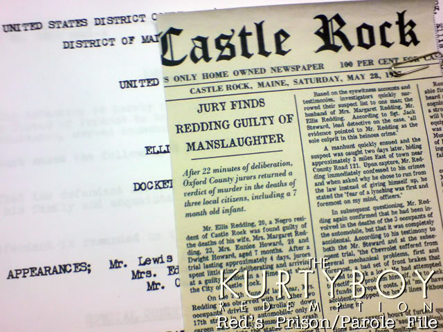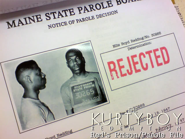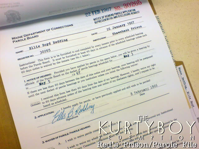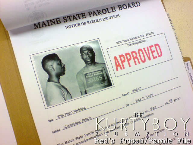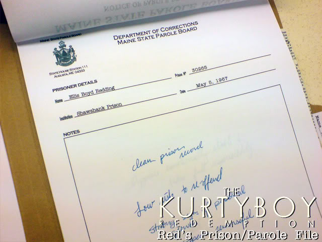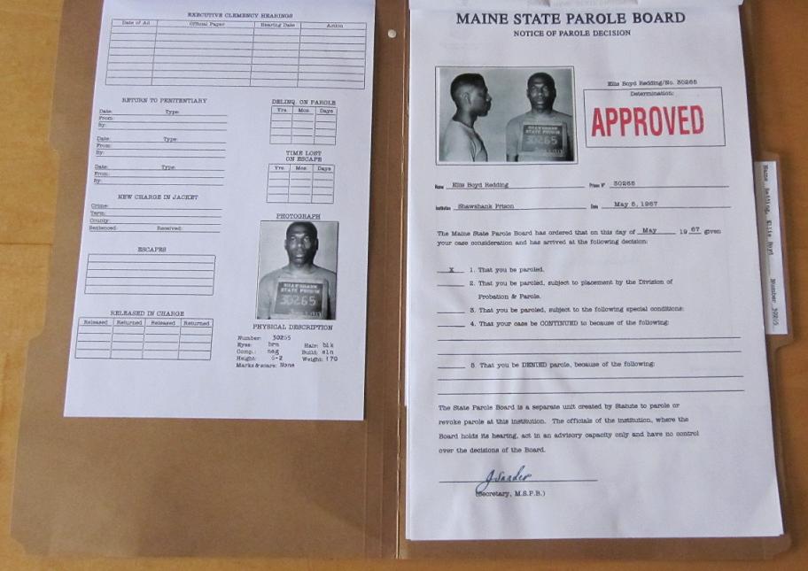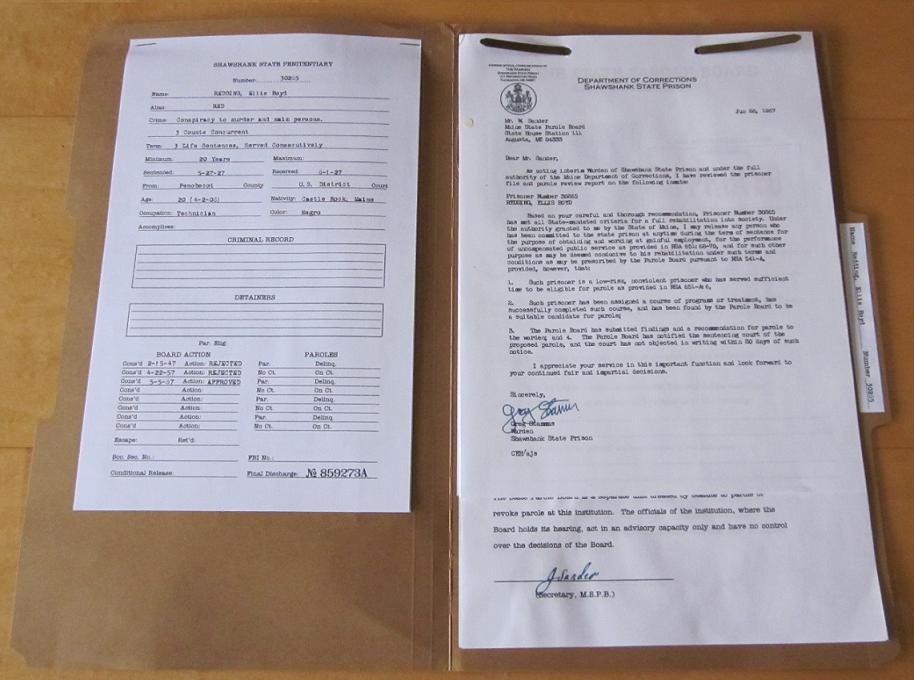 Dieses Set beinhaltet: -Ordner -Zwei Seiten zur Zusammenfassung der Haftstrafe -Zwei Seiten zum Vorfallsbericht von Red's Kriminalität von den Polizisten -Tatort-Foto -Polizei Verhaftungs-Bericht -Fingerabdrück-Karte -Zwei Seite zum Gerichtsurteil / Verurteilungs Bericht -Zeitungsartikel über Red's Verurteilung -1947 Bewährungs Entscheidung Abgelehnt -1957 Bewährungs Entscheidung Abgelehnt -1967 Brief von Parole Board zu Warden -Red 's abgeschlossen zweiseitigen Antrag an die Parole Board -Zwei Seiten Notizen vom Vorstandsmitglied -1967 Bewährungs Entscheidung Akzeptiert -Brief von Parole Board zu Warden