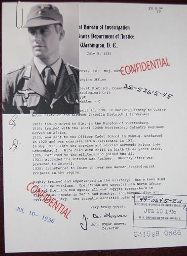 Dietrich hatte die Aufgabe nach der Suche der Bundeslade von SS-Offizier und Mitglied von Hitlers inneren Kreis, Eidel.
