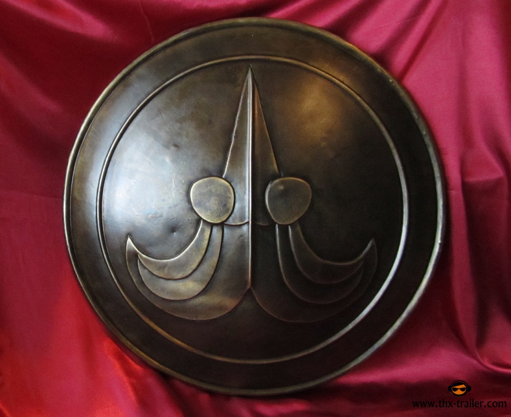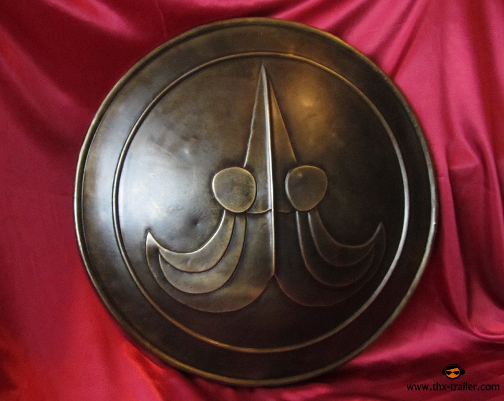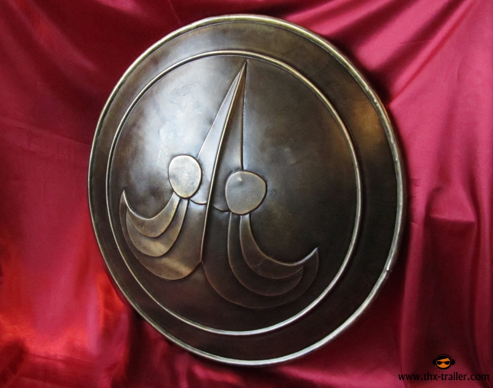 Der Conan Schild ist aus Stahl akribisch nach dem Vorbild aus dem Film gefertigt und wurde so behandelt, dass das Metall wie gealterte Bronze wirkt. Sowohl das archaische Symbol als auch die ringförmigen Umrandungen sind plastisch ausgestaltet. Griff und Unterarmschlaufe des Conan Schildes sind aus echtem Leder gefertigt und mit Schrauben und Muttern angebracht - dadurch kann die Konfiguration des Schildes bei Bedarf vom linkshändigen aufs rechtshändige Tragen umgestellt werden.