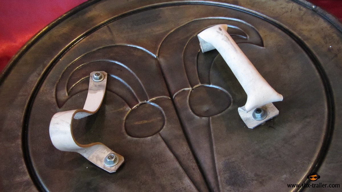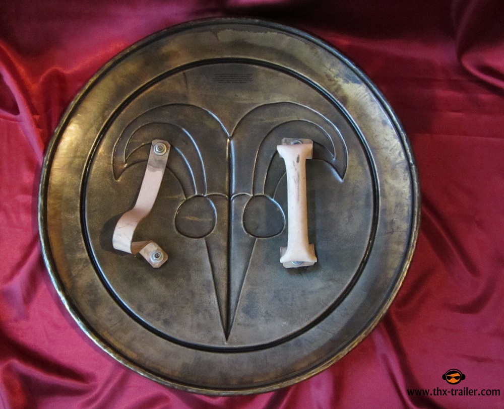 Der Schild wiegt 4,1 kg und hat einen Durchmesser von 63 cm. Ein beiliegendes Zertifikat belegt die Echtheit dieser hochwertigen Filmreplik. Material: Karbonstahl, echtes Leder